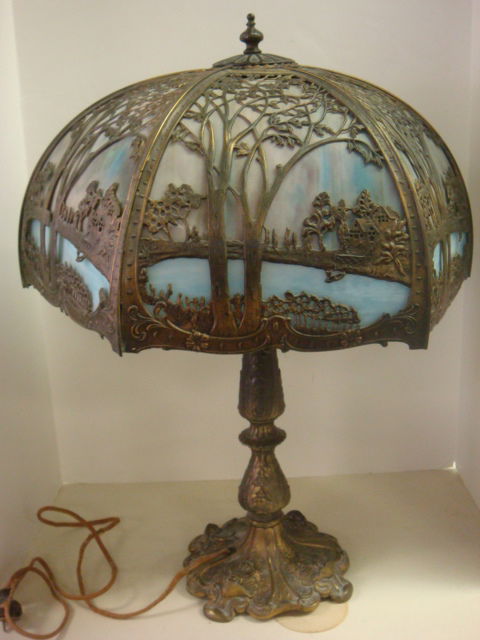 110: VINTAGE SLAG GLASS FILIGREE LANDSCAPE TABLE LAMP ...